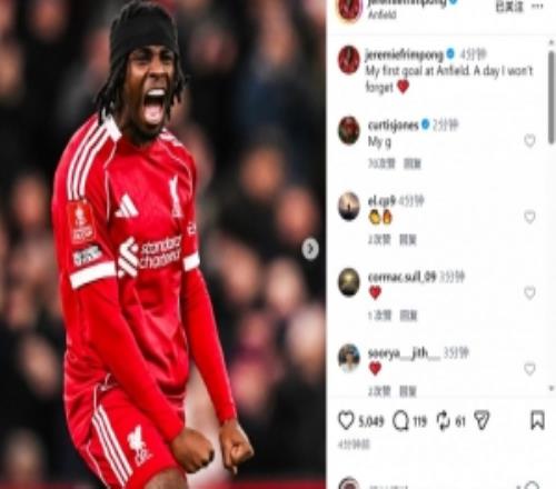 体育播报1月13日宣 足总杯第三轮比赛,弗林蓬破门,利物浦主场4-1击败巴恩斯利,晋级下一轮。弗林蓬社媒晒出庆祝...