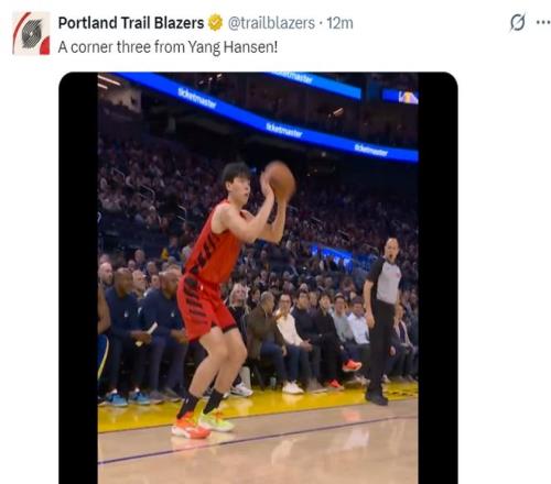 开拓者官方回顾了杨瀚森这个底角空位三分球,开拓者官方还是很关注小杨的。