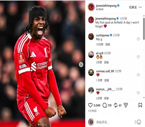 弗林蓬社媒晒出庆祝进球的照片,配文:“我在安菲尔德的首粒进球,我不会忘记的一天。”